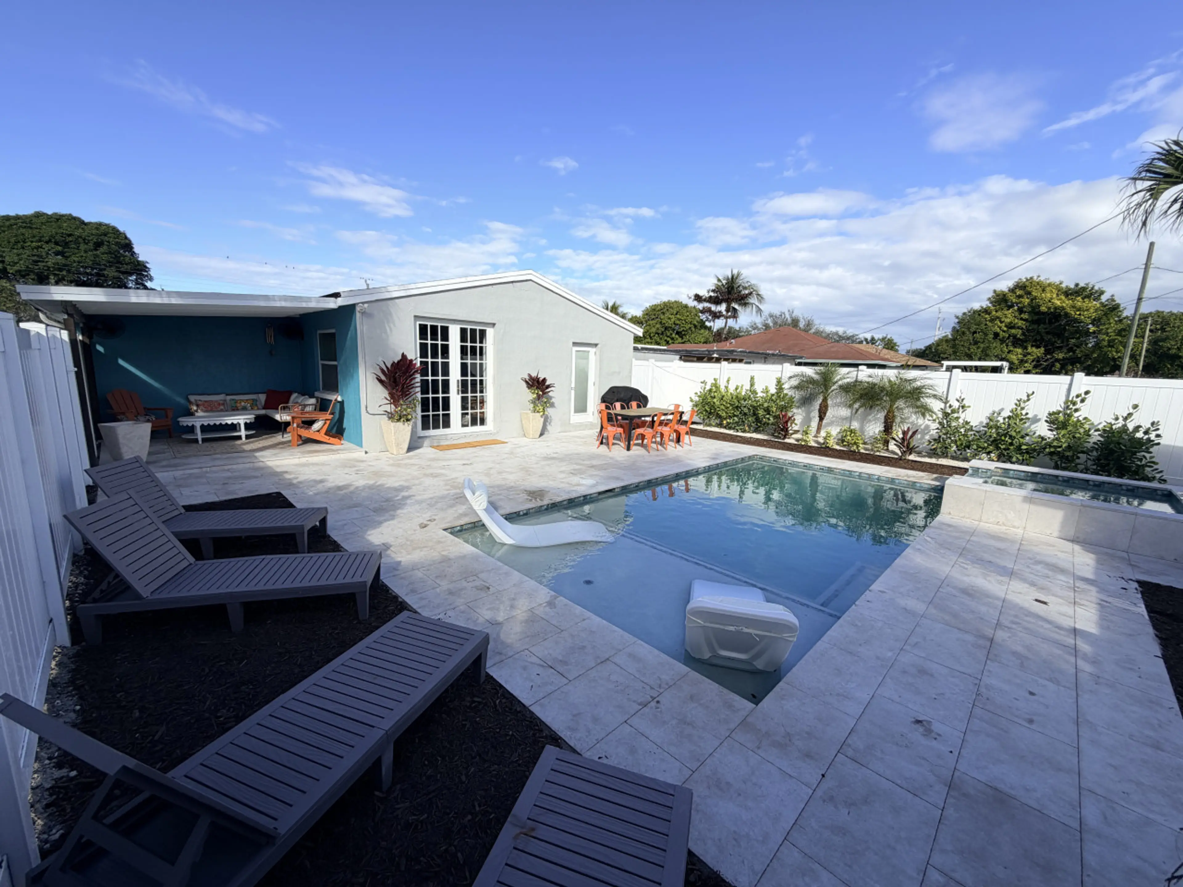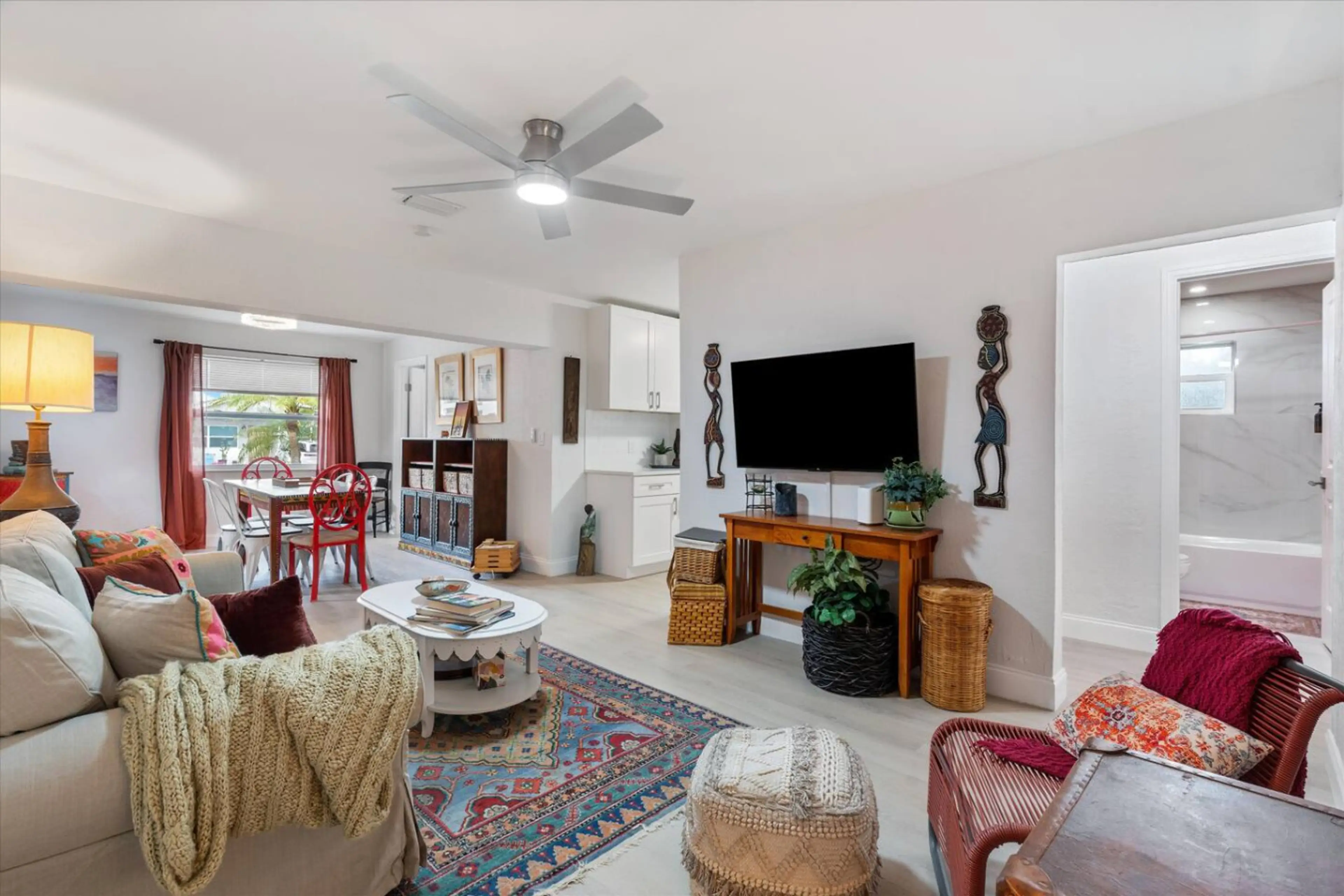The Endless Summer Delray Beach Vacation Rental at 621 SE 3rd Ave is a designer-furnished, 1500 sq ft 3-bed/1-bath property. The amenities include in-unit laundry, a large furnished covered patio, an outdoor and an indoor dining table for 6, lounge chairs, a grill, and a large yard with a dog washing station for your furry friends under 40 lbs. It is located just 3 blocks further south from our other properties. It can be rented alone or with the cottage next door at 625 SE 3rd Ave for larger parties. The shared fence between the homes can be opened to create a shared yard space and access to the pool at 625 SE 3rd Ave.